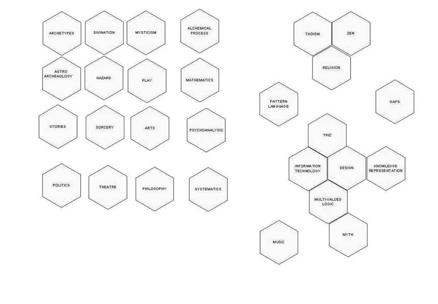 The symbol that appears towards the bottom of the final structure was placed there because of a felt need for an MM to complete the vertical column. This was provisionally identified as language. Adopting this item, the vertical column then appears as a sequence of five MMs, the composition of which was surprising to the players themselves. In a word, it was truly emergent. ‘Hazard’, ‘Animism’ and ‘Shit’ are wild elements while ‘Systematics’ and ‘Language’ appear as domesticated ones.